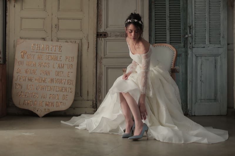 こちらのシューズはかかとの部分にビジューが施されており、イスに座った時のショットでドレスの隙間からチラッと見えるのがとても素敵です。