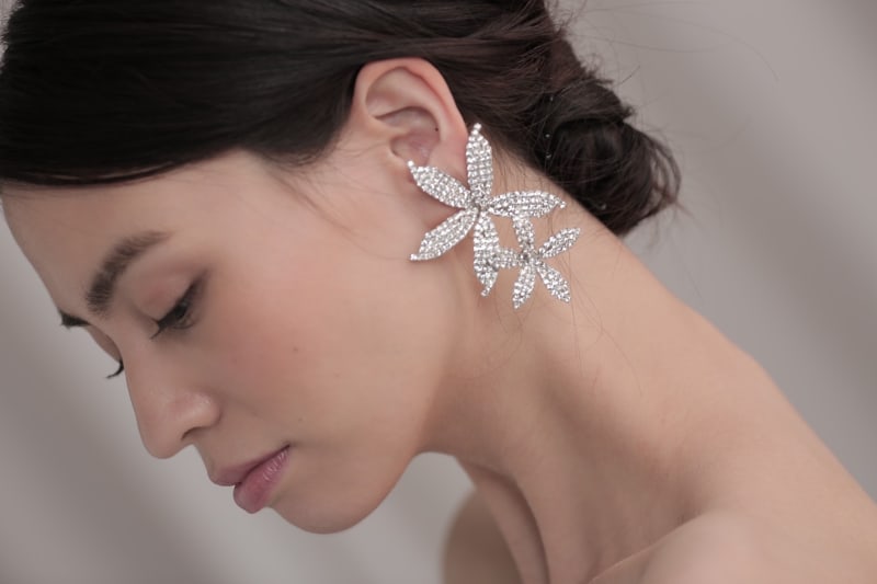 こちらのお花が大小組み合わされたイヤリングは、スワロフスキーがぎっしりと埋め込まれておりキラキラとしたものとなっているので、お顔写りもパッと明るく見せてくれるものとなっています。