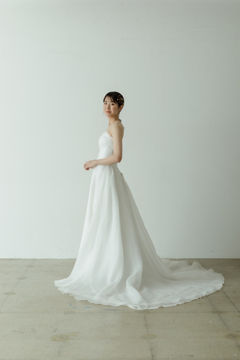 ご新婦様のソロショット!タイトな髪型とドレスがとてもマッチしていて素敵です^^シンプルな白壁から先ほどのミモザのように様々な雰囲気で撮れるのが洋装ハウススタジオの魅力です。