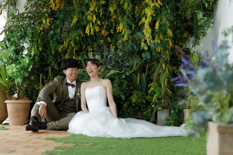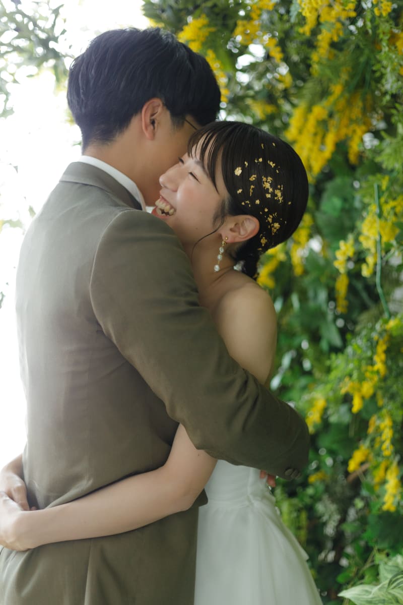今にも笑い声が聞こえてきそうなお二人の表情。 ミモザの明るい雰囲気ととても合っています。