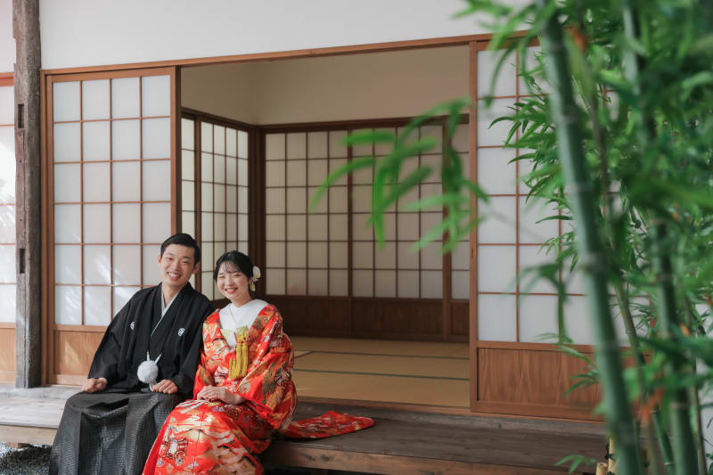 竹の瑞々しさがご新婦様の赤のお着物を際立たせています^^