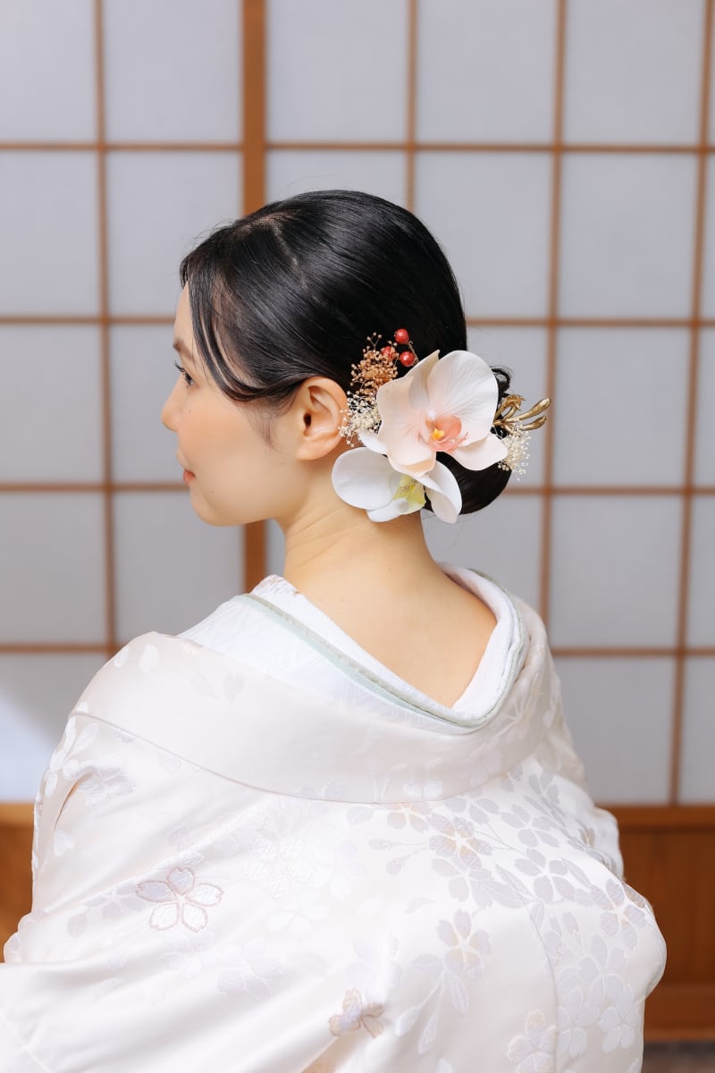 タイトなシニヨンは和装にぴったり!お花も白無垢にあっていて素敵ですよね♪