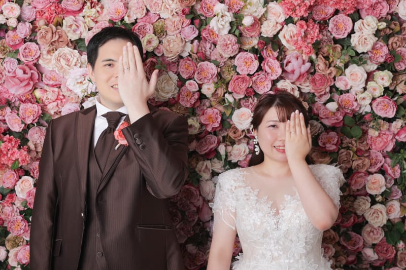 お二人にあった可愛らしいピンクいっぱいのお花に囲まれてお揃いのポーズ^^