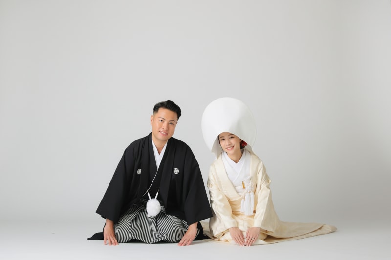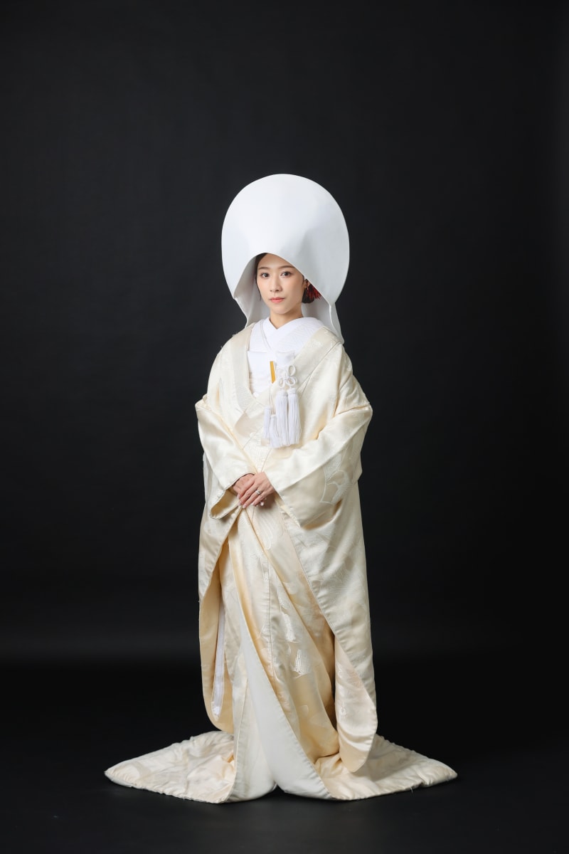 白無垢に綿帽子をつけて、再度黒い背景に。