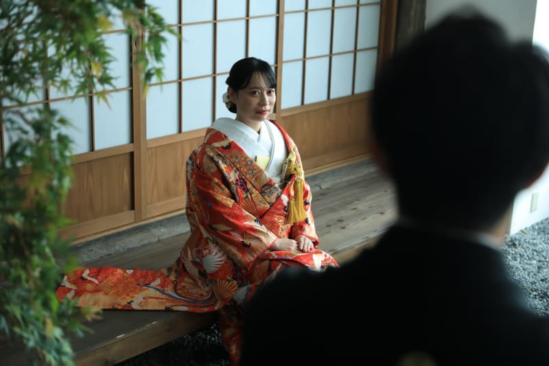 婚礼を終えたあとの「色直し」では、今までの白無垢を脱ぎ、婿から贈られた色物(赤地)の衣服に改めました。