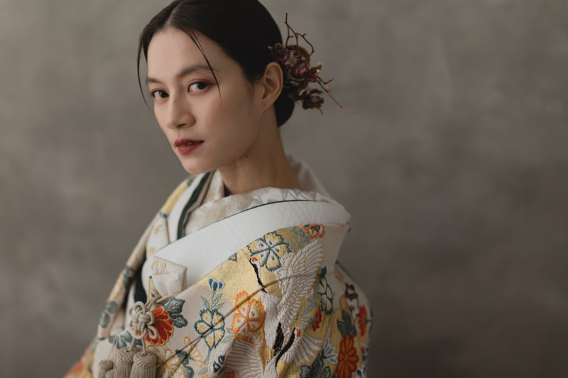 ヘアスタイルはスッキリしたアップスタイルに直線的な枝と色味の濃いお花を合わせてスタイリッシュに仕上げました。