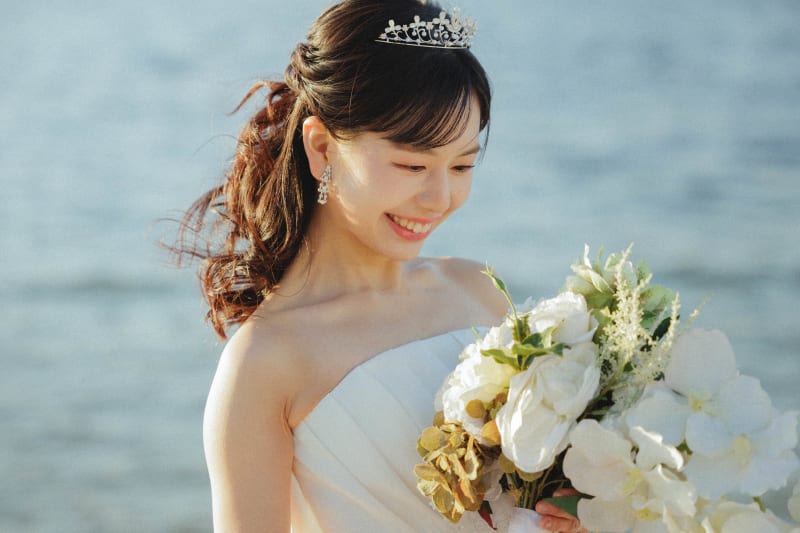夕日の柔らかい光に包まれて、風でドレスがなびく様子もとても素敵でした^^