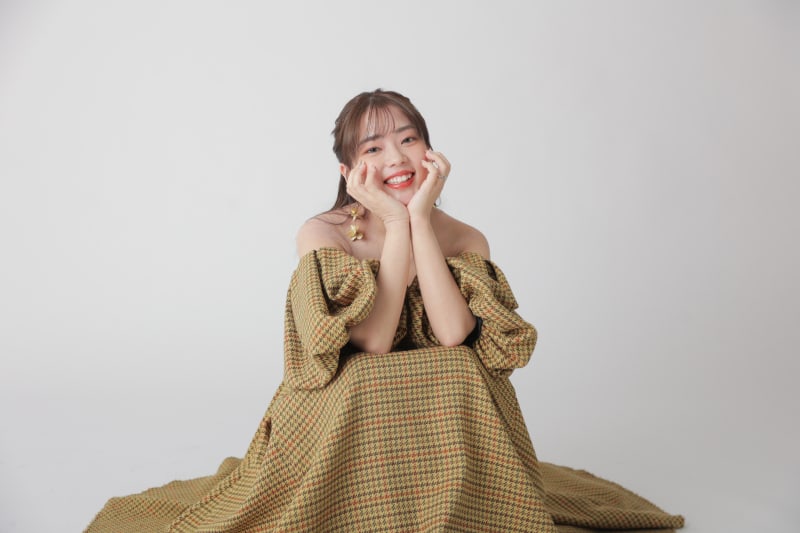 袖がボリューミーで色も明るいチェックのドレスにチェンジして一気に雰囲気チェンジ!