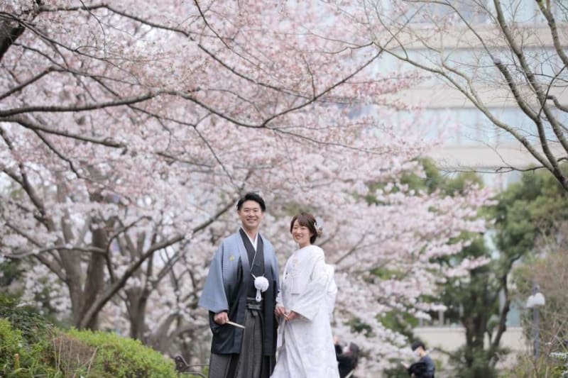 庭園跡の檜町公園で和装ロケーションフォトが叶います。東京ミッドタウンに隣接している檜町公園で和装を着て撮影ができるプランです。庭園から公園となった今でも日本の美しさを感じられ、春にはしだれ桜やソメイヨシノの美しい景色が広がります。