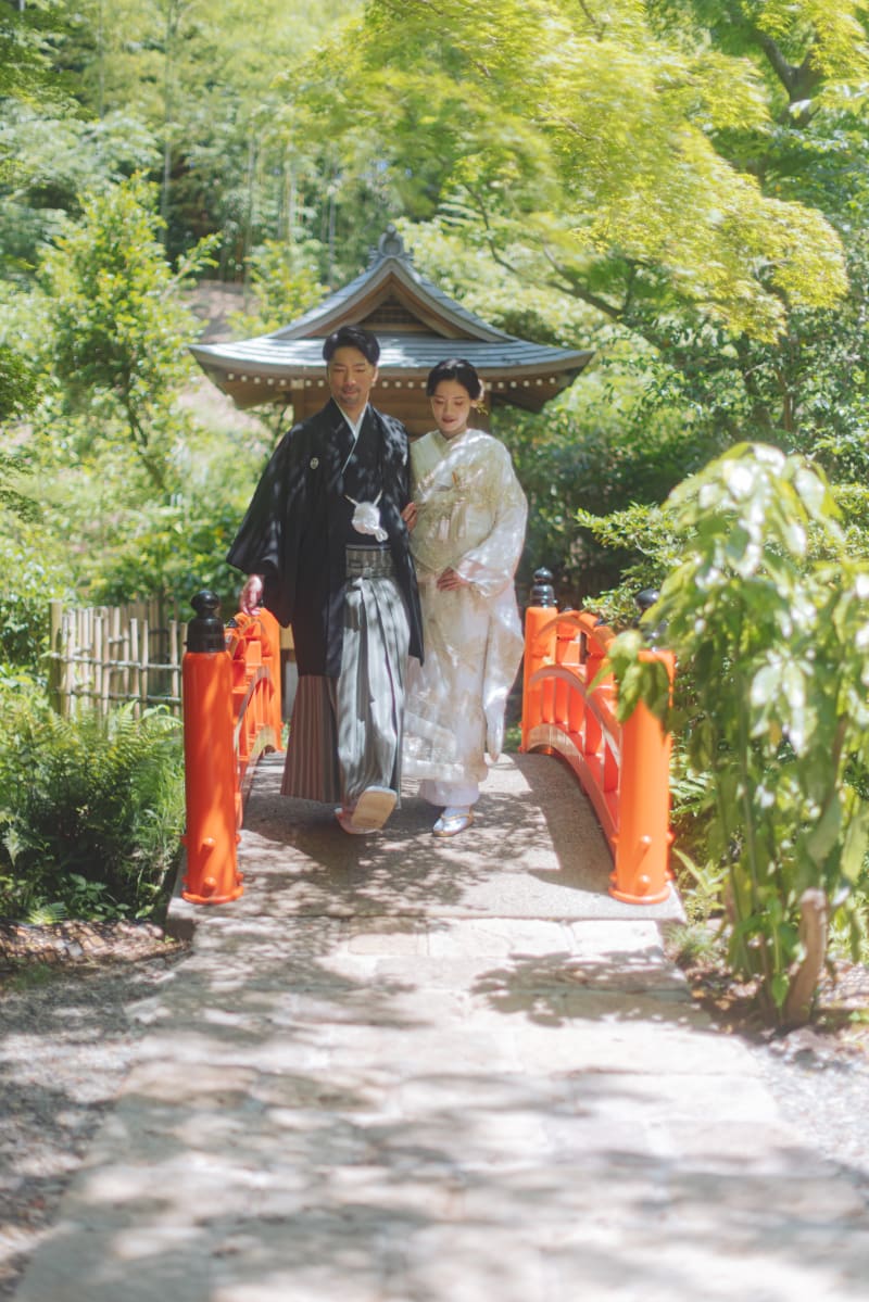 赤い太鼓橋を渡る姿はまさに日本の美の象徴。お二人の歩む人生の門出にふさわしい光景となりました。