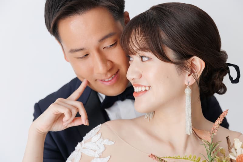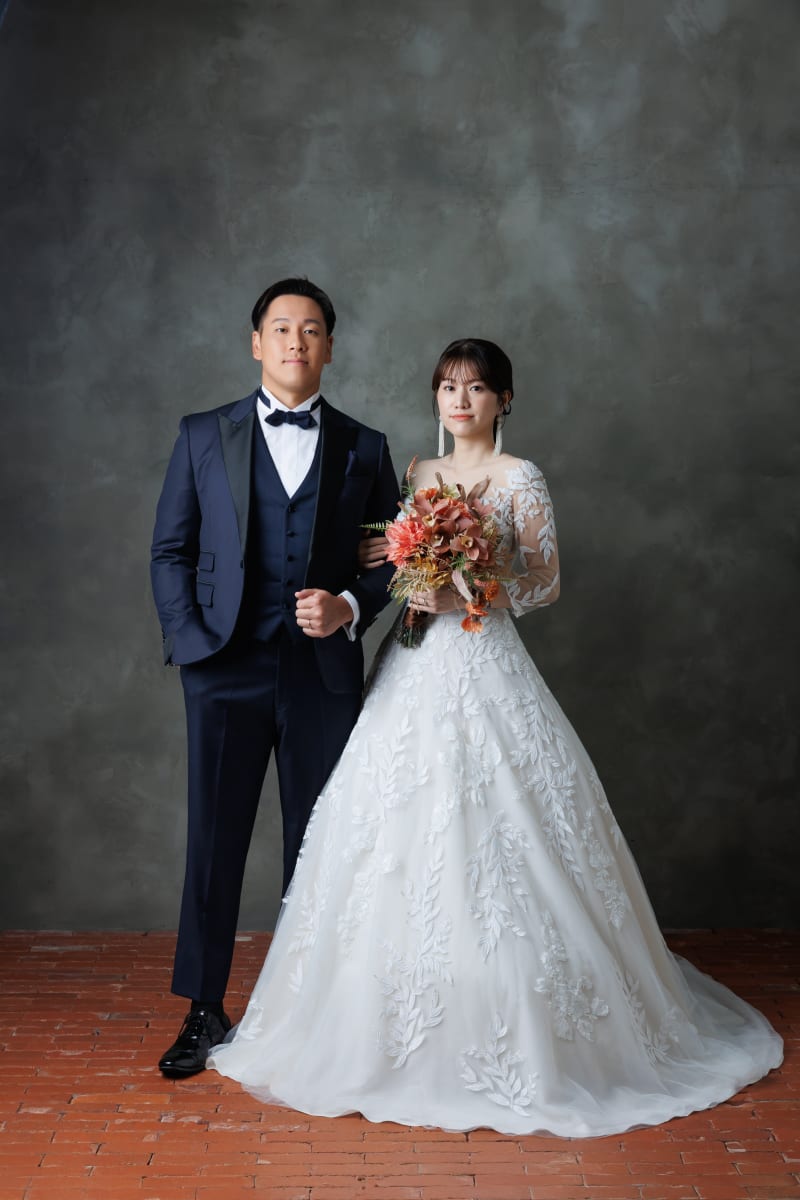 また、純白の背景もご用意しており、ウェディングにふさわしい清楚で上品な一枚を残すことができます。シンプルだからこそ、ドレスやおふたりの表情が一層際立ち、記念にふさわしいお写真となります。