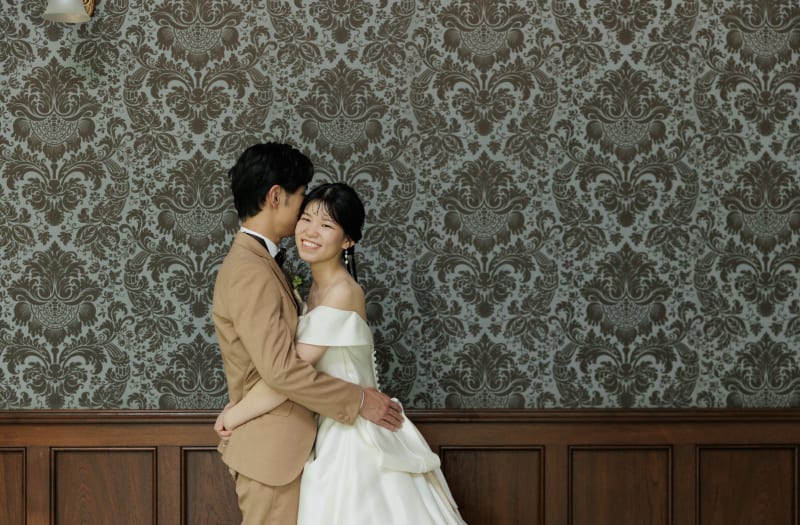 旧古川邸は壁紙もすごくおしゃれなのでサテンドレスとすごく相性抜群です!