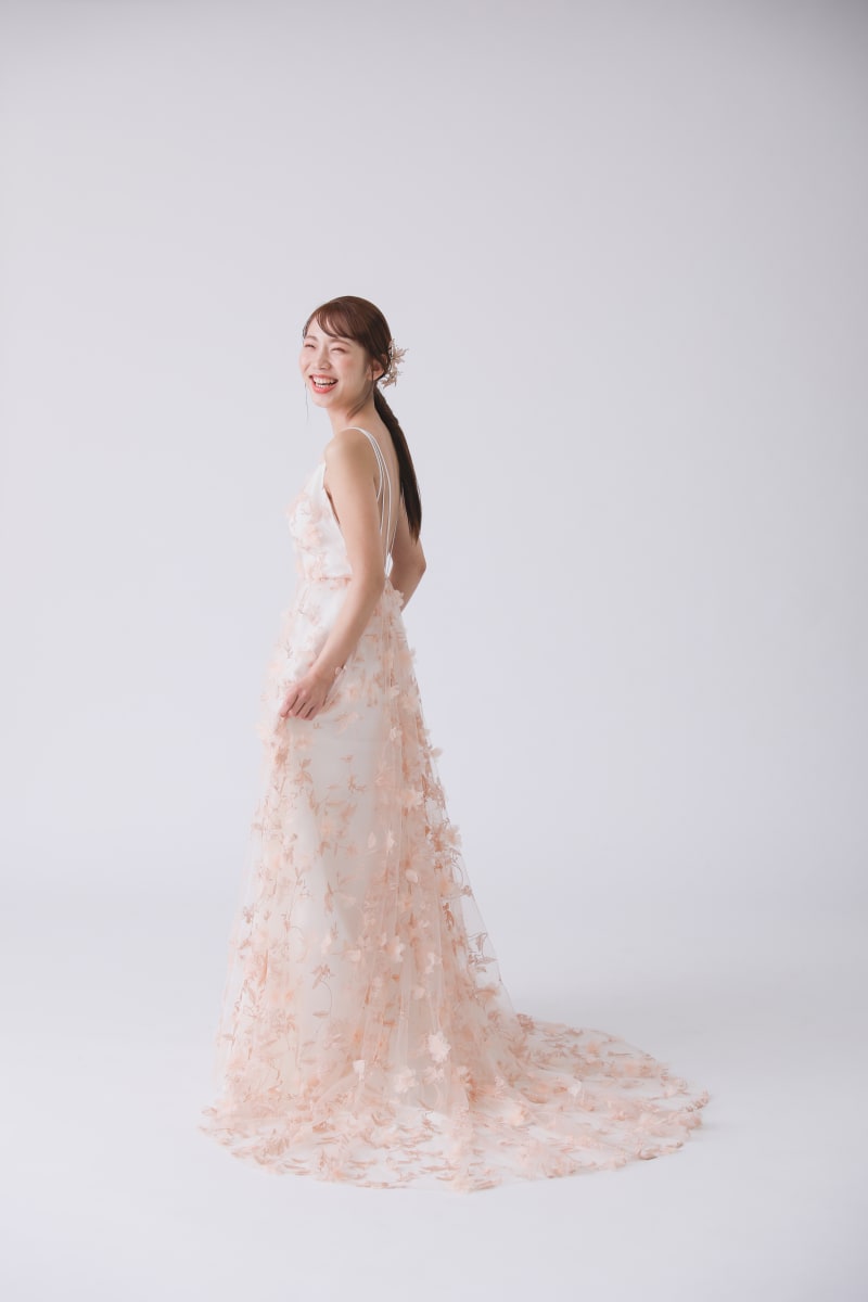 華奢な肩ひもと淡いピンクのお花がかわいらしいキャミソールドレス。