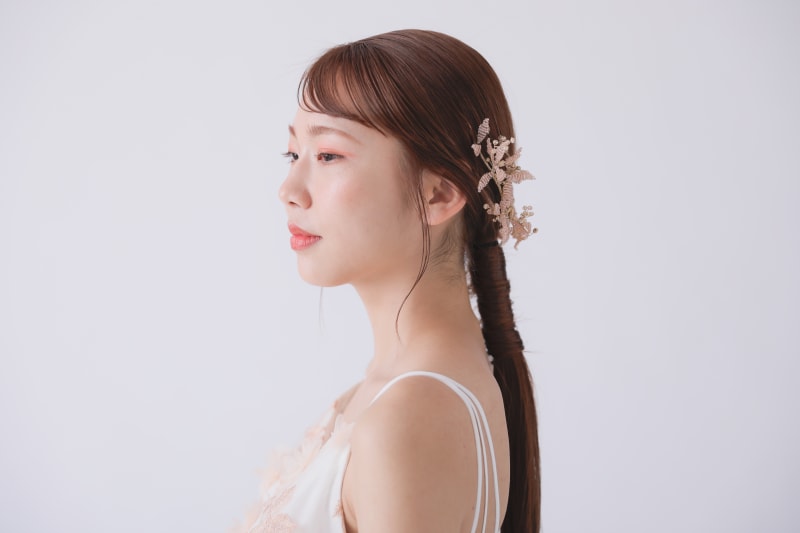ピンクメイクには甘くなりすぎないよう、ウエットなタイトポニーテールに仕上げました。