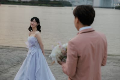 新郎新婦様は、とても優しく、見る人を幸せにするほどの可愛い笑顔が印象的でした。その笑顔が、お台場の煌びやかな夜景と相まって、特別な雰囲気を一層引き立てていました。