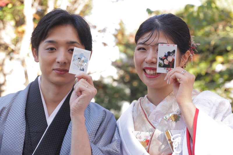 撮影中、新郎新婦はチェキを使って顔を隠すユニークなショットを楽しみました。このようなお茶目なアイデアが溢れるお二人との撮影は、とても楽しかったです!