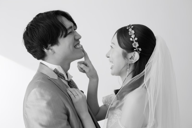 ご新婦様が、ご新郎様のお顔の中で好きなパーツを触ってお二人で微笑みあっている素敵な一枚✨