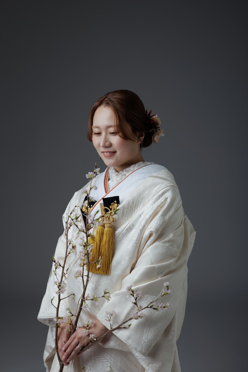 白無垢にはお持ち込みの桜を合わせ、細部までこだわった全体コーディネートに仕上げました。