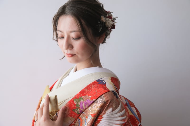 定番のお辞儀のショットも!お着物もきれいに整えてから撮影していきます