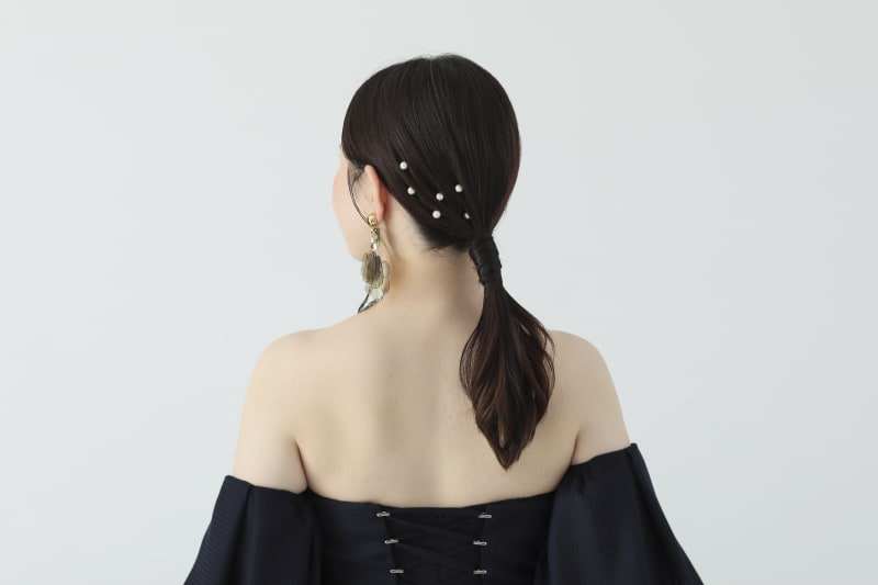 今回はカラードレスにタイトなポニーテールを合わせた