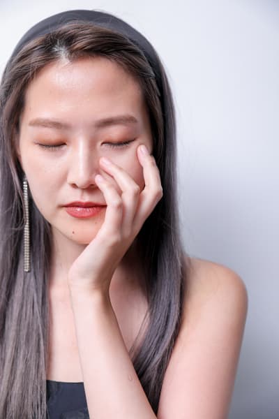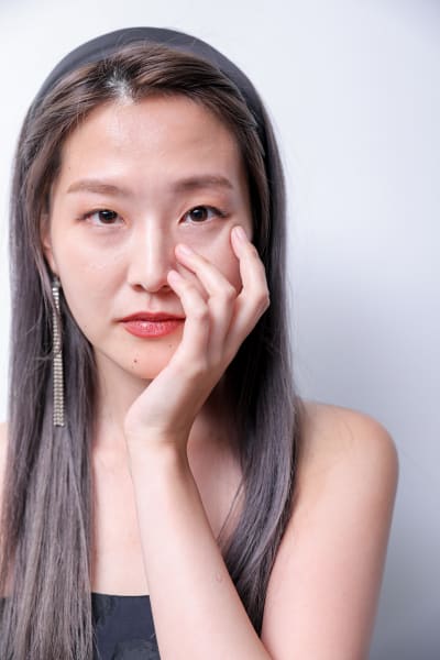ヘアスタイルは前髪だけをねじって、ストレートに。