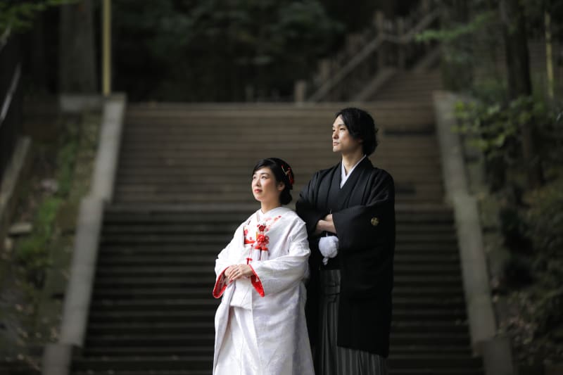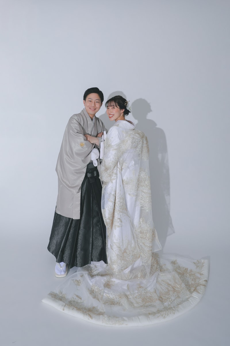 最初にご紹介するのは、白無垢に梅柄の掛下、そして統一感を意識した