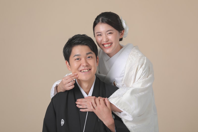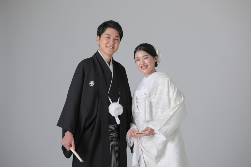 白無垢で背景無地のスタジオの撮影。シンプルでかっちりした印象になります。