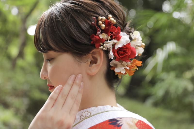 こちらは造花の髪飾りですが当店にはオプションのものでドレイフラワーなどもございます!