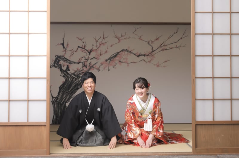 新婦様は赤の色打掛で新郎様は黒の紋付袴で一番人気の組み合わせです♪♪