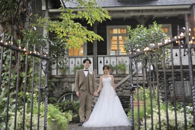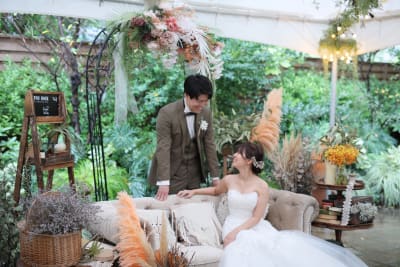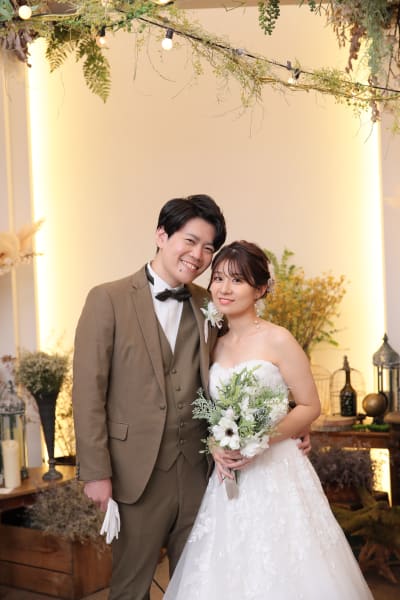 その場所に合わせて柔らかい雰囲気のドレスと少しカジュアル感のあるカーキのタキシード