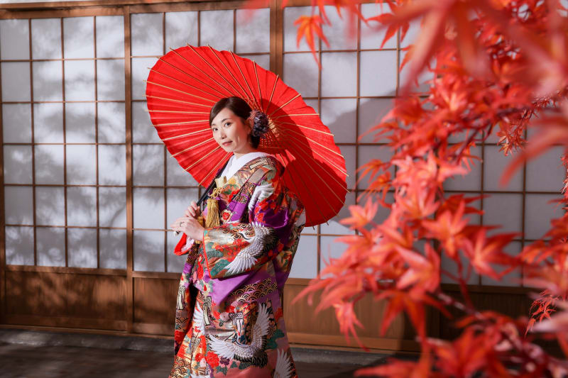 ご新婦様のソロ写真では紅葉も使用しちゃいました!
