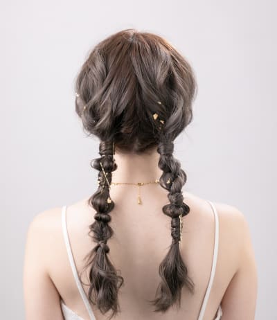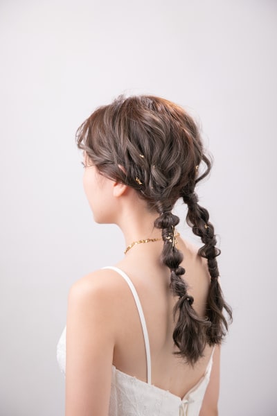 こちらはツインでそれぞれを編み込み、くるりんぱ、フィッシュボーンを組み合わせたタイト目なヘアアレンジ。金箔やゴールドピンを使い華やかな印象になります!