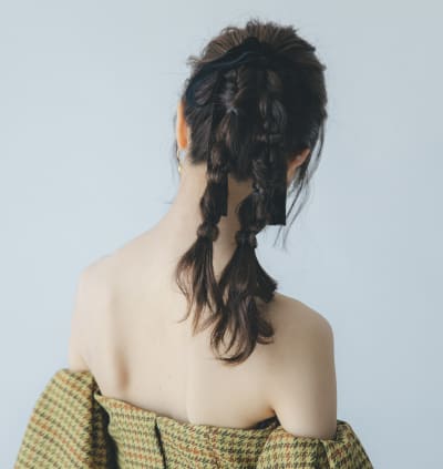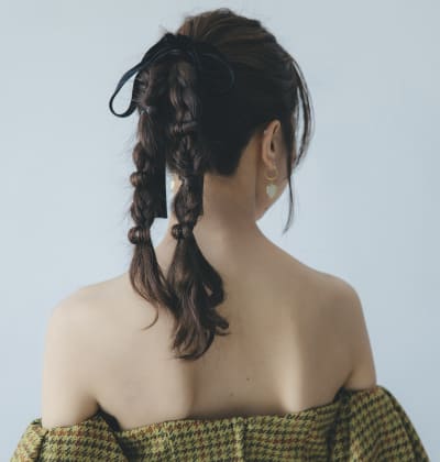 こちらのヘアスタイルはポニーテールで毛先を二つに分けてそれぞれアレンジしたスタイルとなっています。最近は編み下ろしのアレンジが人気でその中でもちょっとタイト目なアレンジが多いです!元気な印象でチェックのドレスにお客様にお持ちいただいたベロアのリボンもとても合っています。