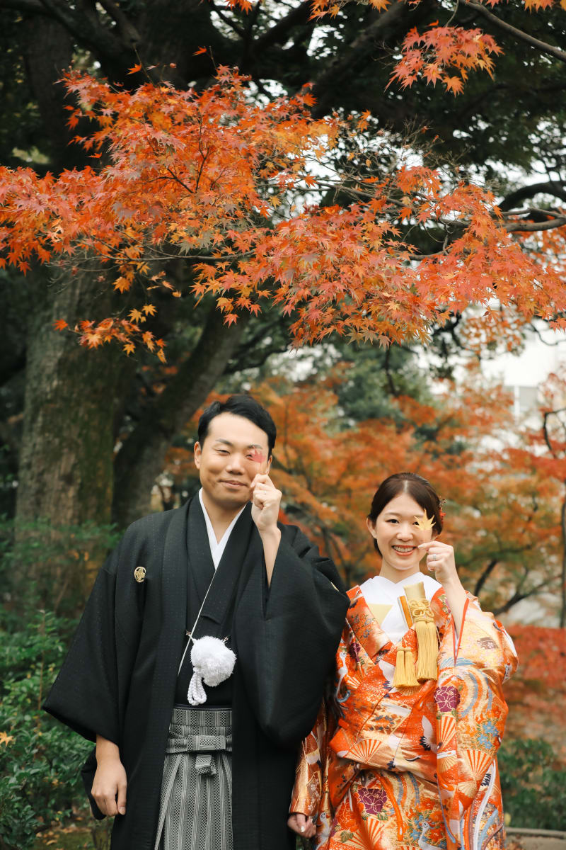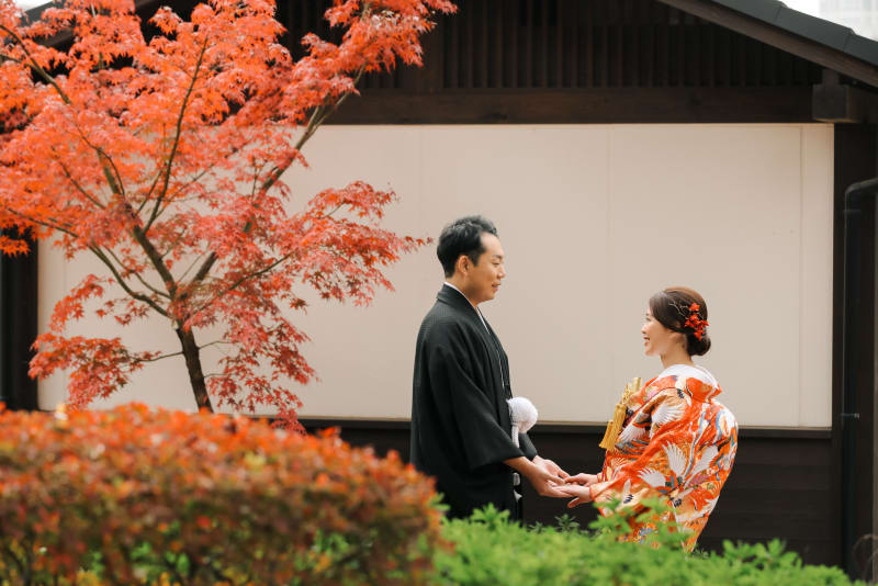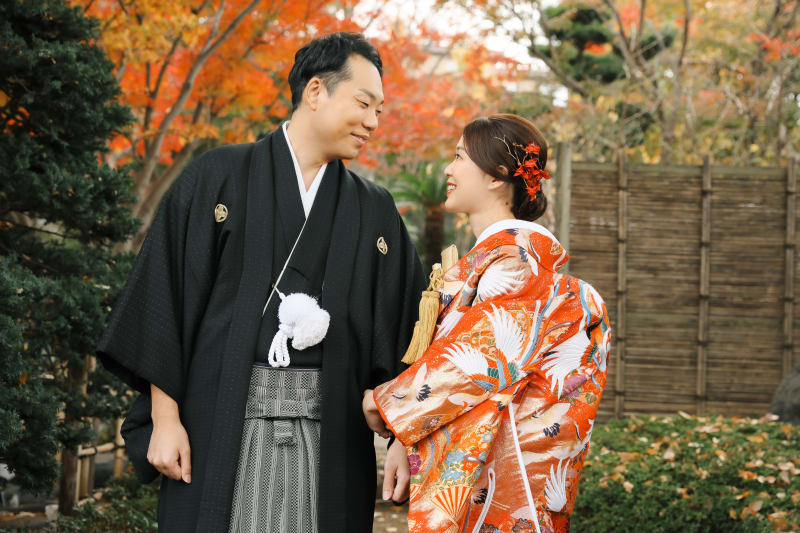 締まりのある黒正絹の紋付に、華やかな赤の色打掛が紅葉ロケーションにぴったり!笑顔もグッドでした☆