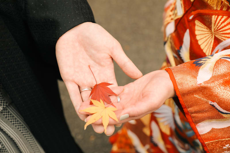 赤と黄色の紅葉と、指輪がキラリと光イメージカットも撮影させていただきました!この時期ならではのカットもいいですね!☆