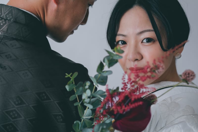 和装の撮影は生花をお持ちいただくとお洒落で尚且つ新婦様にしか出せない雰囲気を出せるので持ち込みの方が多いです!