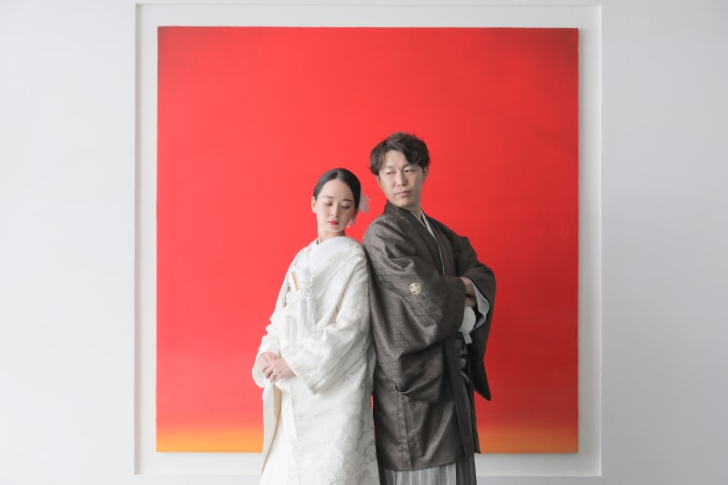 続いて新郎さんも。お二人とも同じ背景で、同じポーズでお揃いショット!チャコールグレーの紋服がとってもお似合いでした!