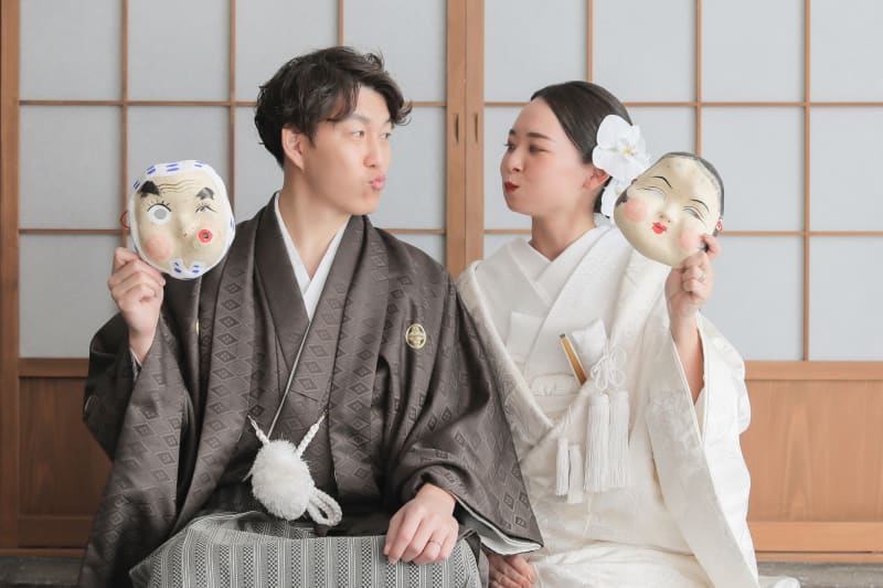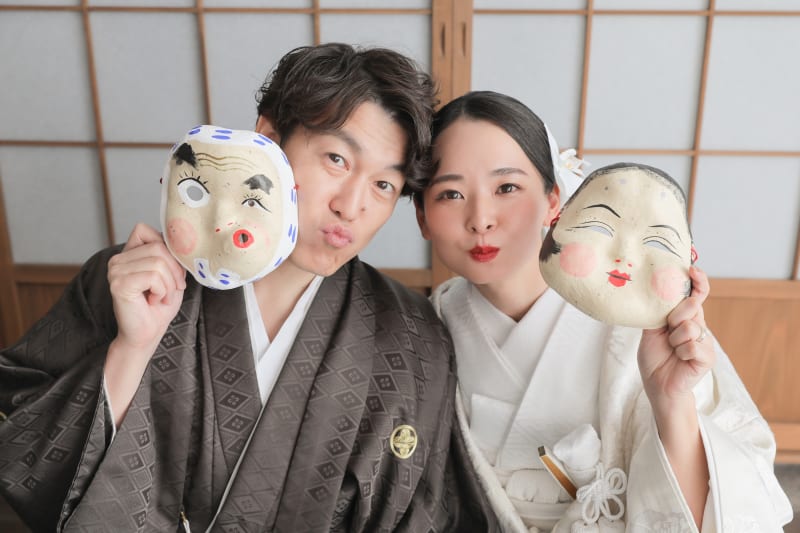 おかめとひょっとこのお面を持ってきてくださいました!思わず、「顔真似してください〜!」と言ってしまいました(笑)
