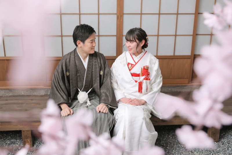 こちらの新婦様は梅の掛下と懐剣箱迫のお花を合わせて統一感を出したコーディネート。 白無垢の白と対称的な色なのでよく目立ちますね! お花も赤を入れることでアクセントになります。