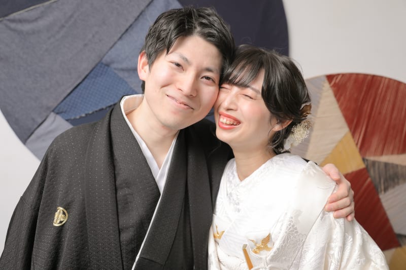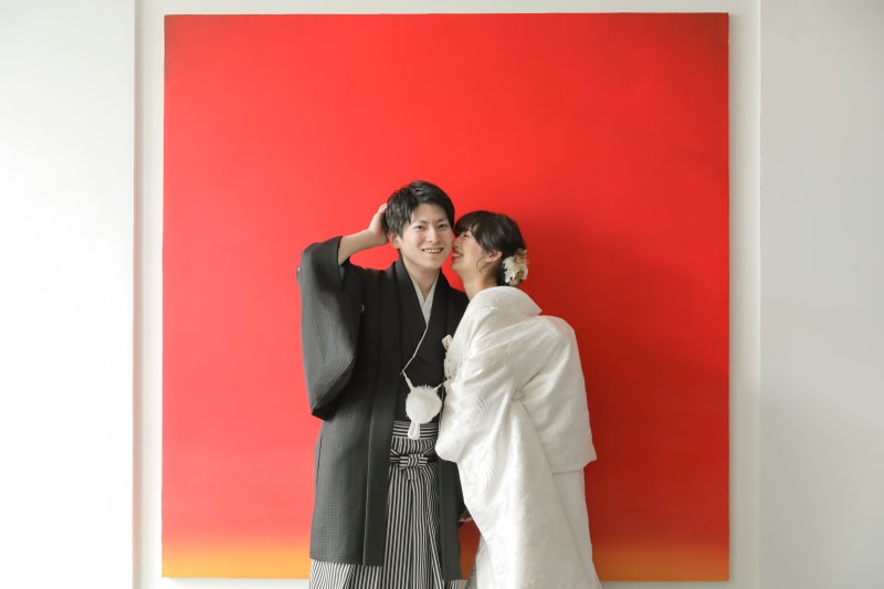 赤背景に白無垢がとっても映えます!目を瞑って和装らしくしっとり。