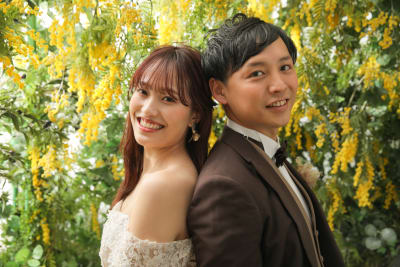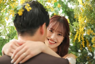 お二人とも笑顔が素敵でミモザも似合っていました!