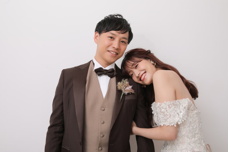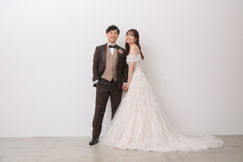 全身のお写真も白の背景がシンプルでよりお二人を引き立てますね!