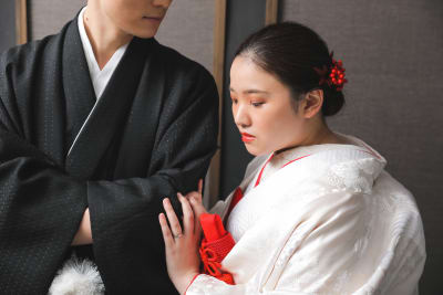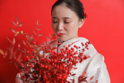 赤比翼の白無垢、赤リップ、赤い身のついたヘアアクセサリーとブーケ。白と赤、ご婚礼のお写真ならではですね。