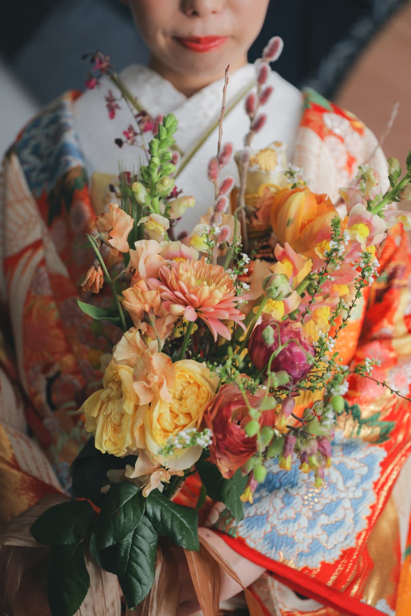 華やかな赤色の色打掛に合うコーディネートとして襟元はポイントで緑色とゴールドを入れてます! 着物の色味と統一感を合わせる為に、色鮮やかなブーケを使ってみるのも可愛いです◎