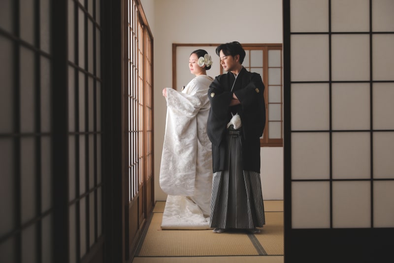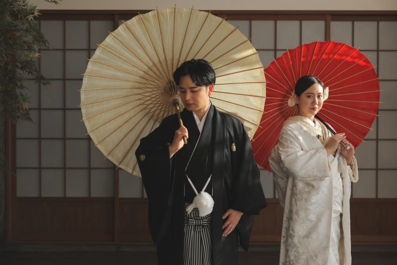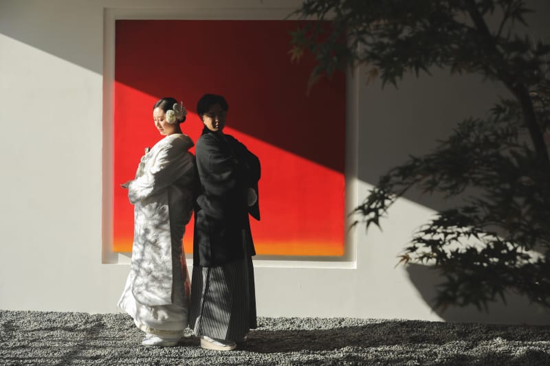 赤の背景に映える白無垢がとっても綺麗