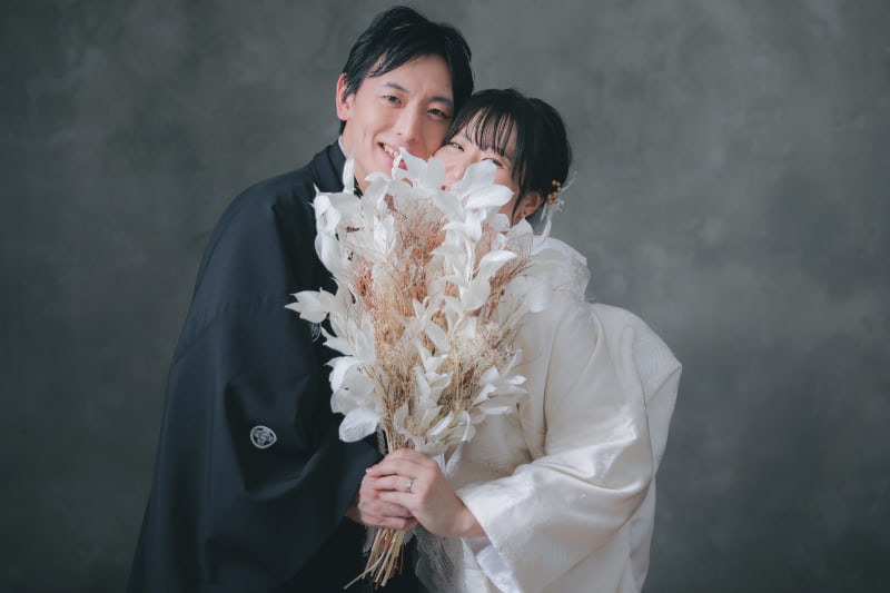 今回は和装でのハウススタジオの撮影についてご紹介します! 渋谷店には様々な雰囲気で撮れる背景のご用意があります。 こちらの背景はかっこいい雰囲気で撮ることができるグレーの背景。 あえて可愛らしいブーケをもってお顔隠しショット とても可愛いです!