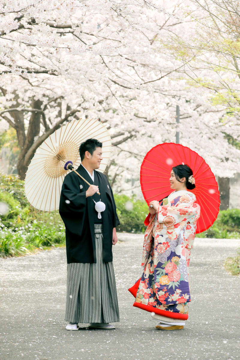 和装の撮影では必須の和傘は桜でもピッタリ合います◎