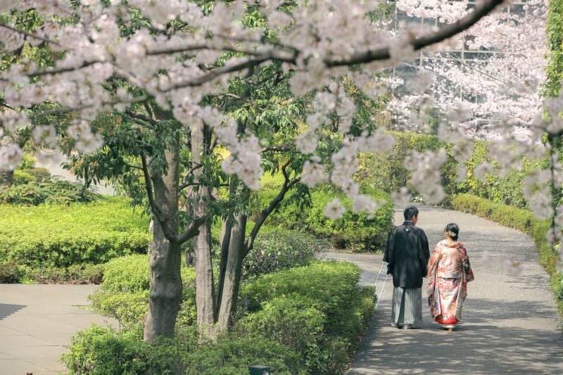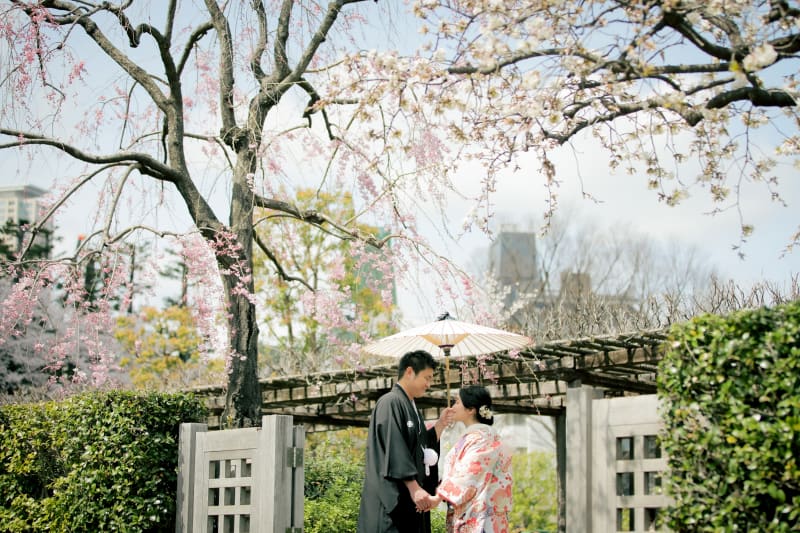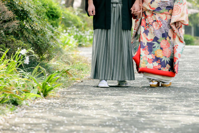 新郎様の袴は市松柄といい、柔らかい印象を与えるので桜の優しい可愛い雰囲気に合います!