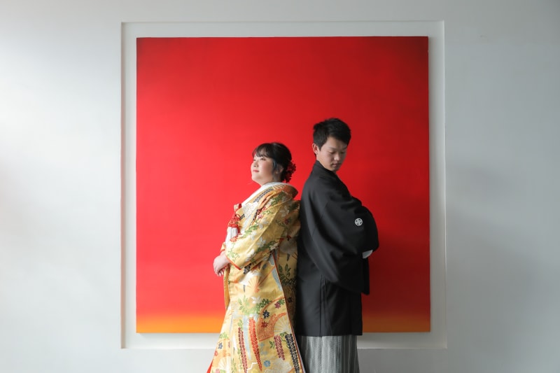 雰囲気をガラッと変えて、赤背景でクールに。お着物が映えますね♪