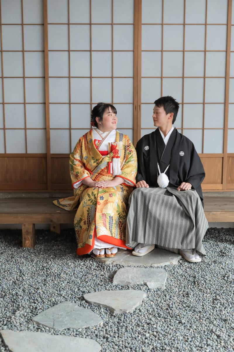 床には砂利が敷かれ、石畳もあります。鮮やかなお衣装がとてもお似合いでした!